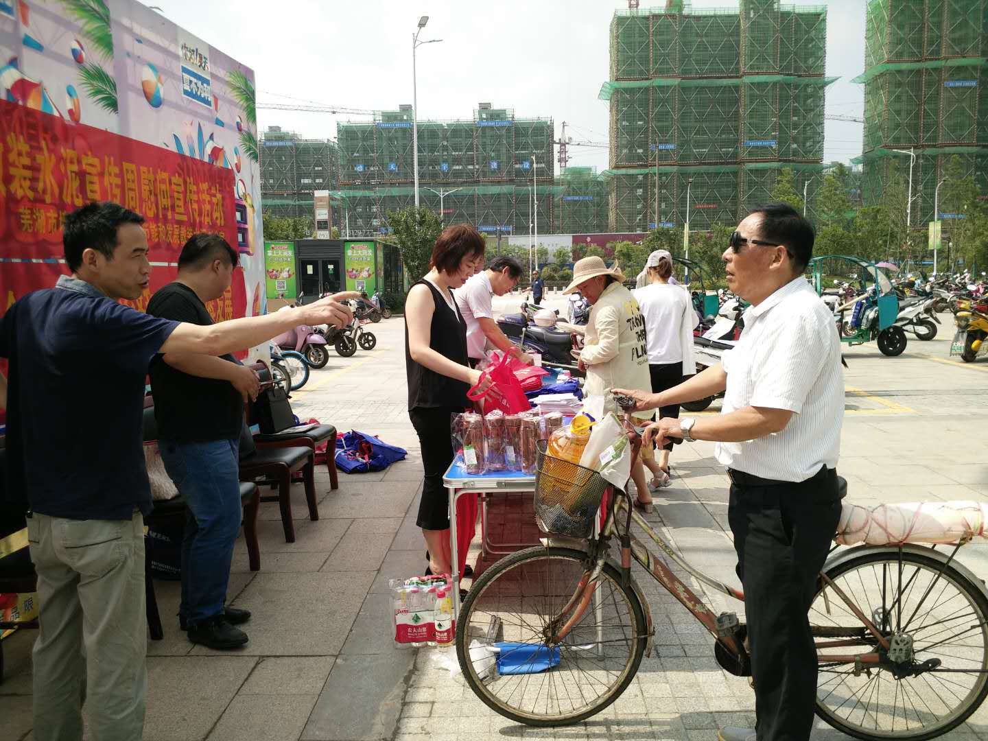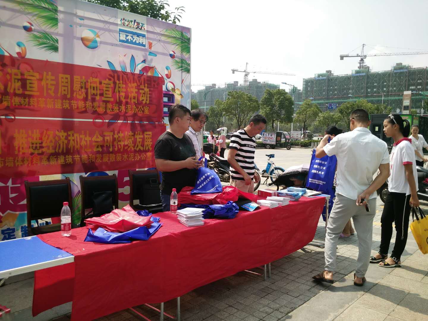 6月29日,工作人员冒着高温酷暑,在“大润发”广场向游客普及节能低碳生活常识,讲解节能环保的重要意义。通过发放雨具、保温杯、环保袋等纪念品和节能宣传册吸引广大市民参与互动,并结合工作实际,大力宣传墙改节能和发展散装水泥的政策法规,使广大市民深刻了解使用新型墙体材料、散装水泥,预拌混凝土和预拌砂浆对节约资源、保护生态环境的重大意义。宣传方式深入人心,效果十分显著。