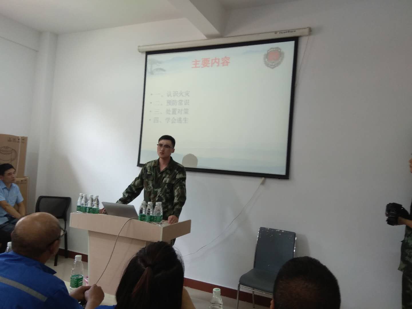 本次培训分为三个流程,一是知识讲座。县消防大队的朱教官详细讲解了消防安全、逃生自救等知识,并结合实际火灾案例进行分析,说明了消防安全工作的重要性。二是实操演练。几名消防教官利用灭火器进行现场灭火示范操作,学员们演练的有模有样。三是专业消防灭火。消防官兵们熟练地拿起消防车上消防带,进行喷水灭火,火势立马得到了控制。